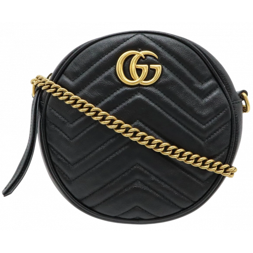 Gucci Marmont Mini Round Camera Bag - черная кожа Chevron, золото Double G. Компактная и стильная круглая сумка, выполненная из мягкой мателасы кожи в Chevron-узоре, украшена классической золотой фурнитурой Double G. Идеальна для вечернего выхода или придания шику к повседневному образу. Лимитированная модель из классической не выходящей из моды линии.